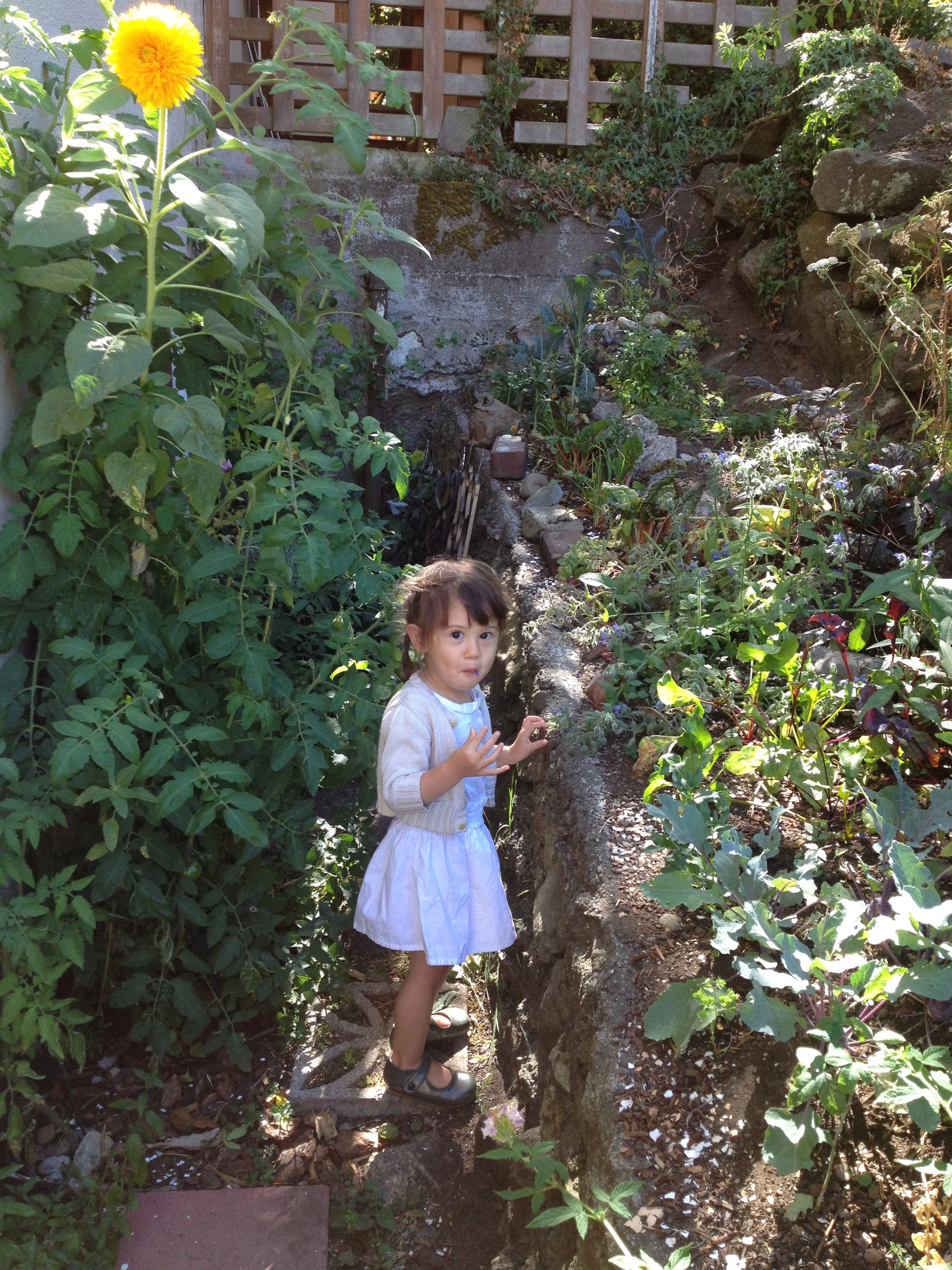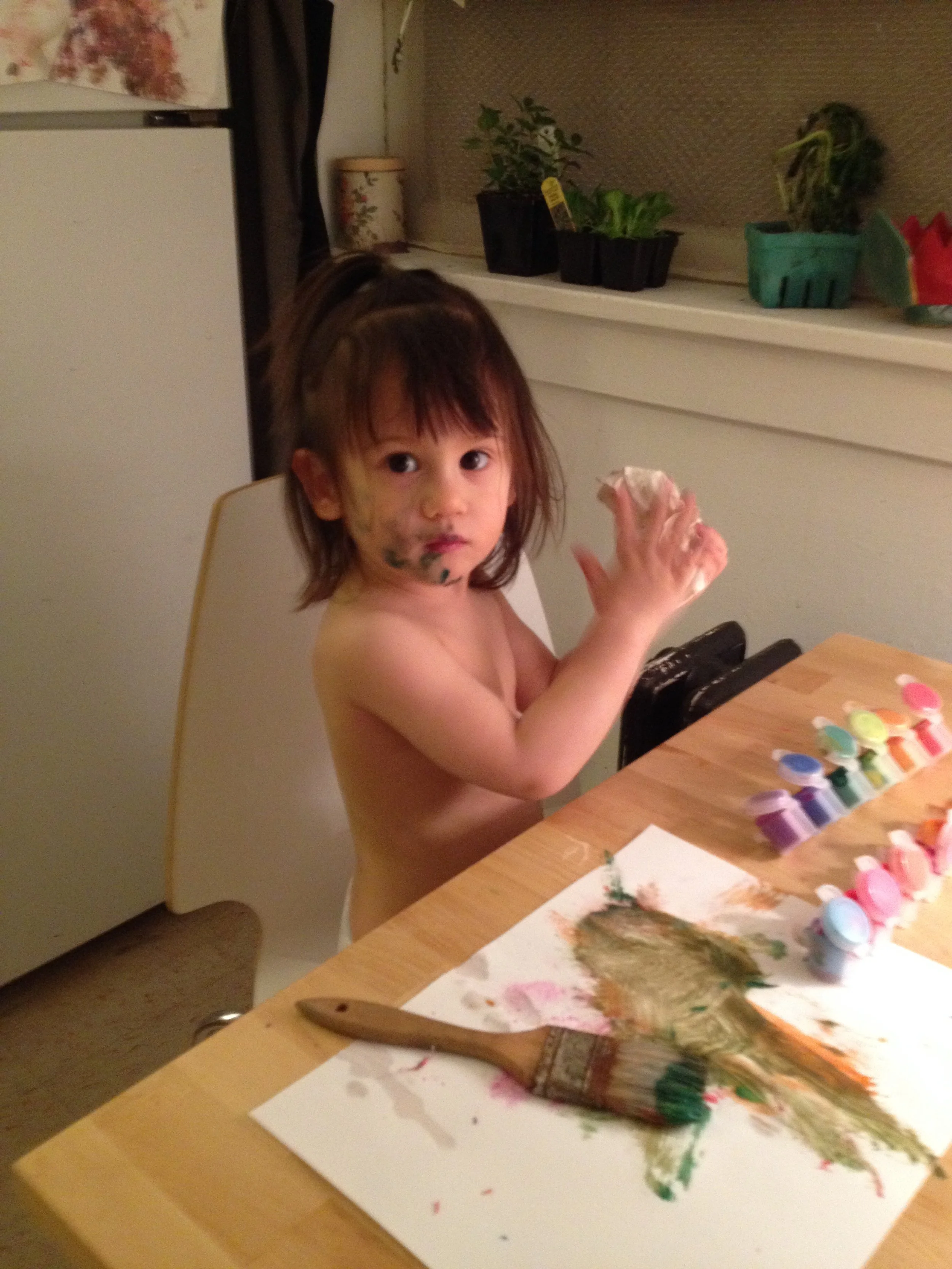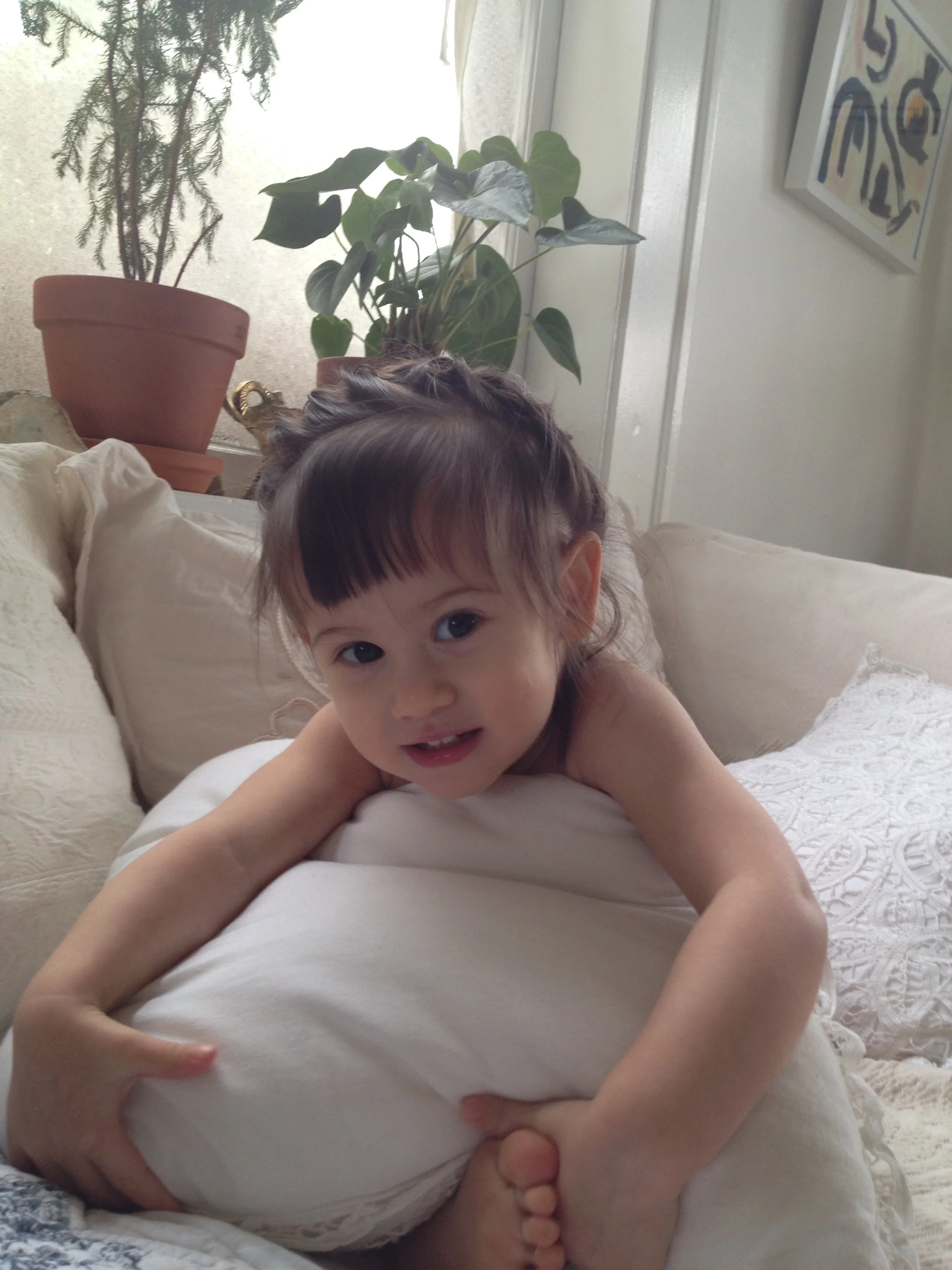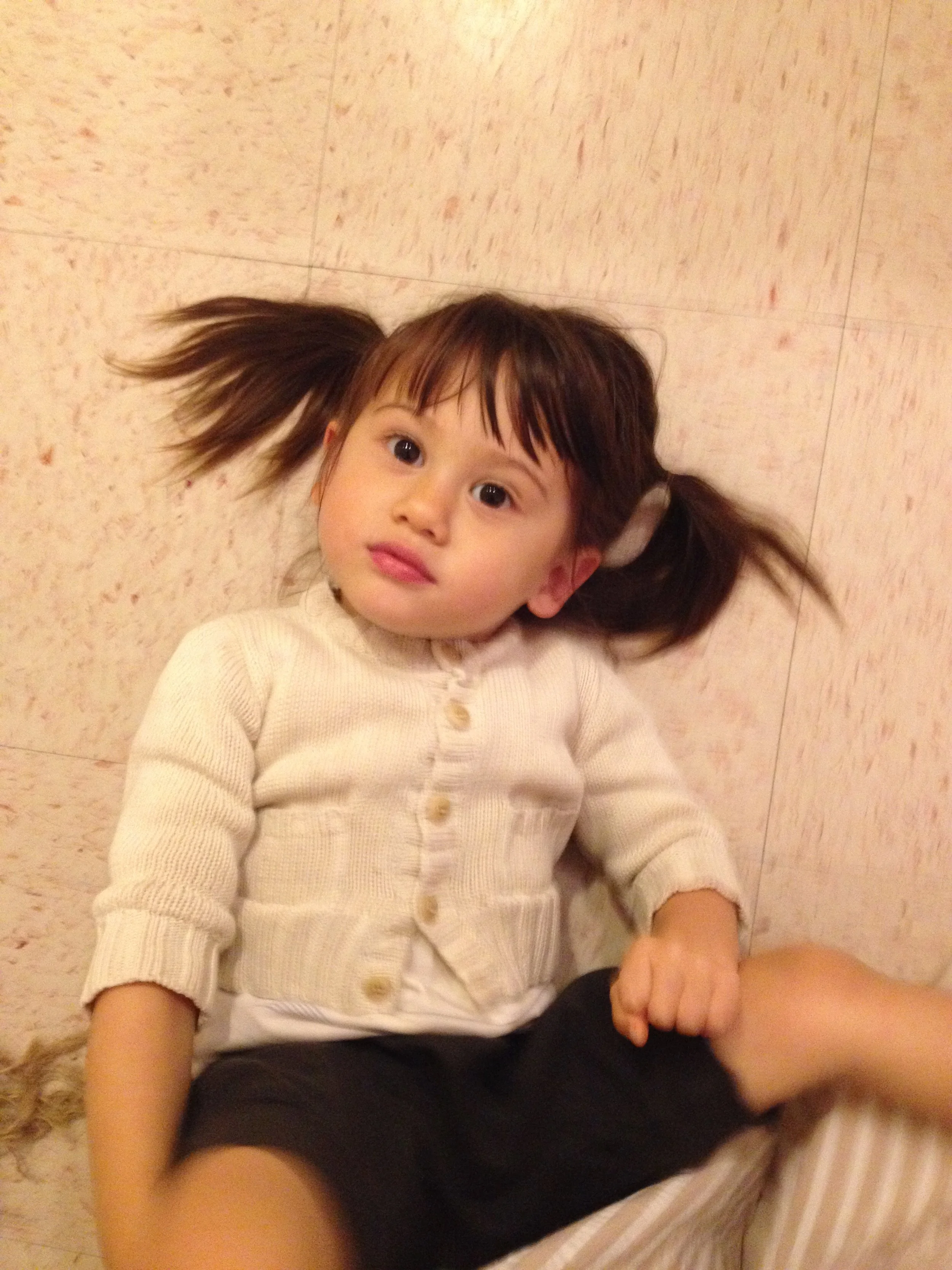 She speaks English. She dances and sings. She knows right from left and can get most of the way through the alphabet. She counts to ten and says please, thank you, and excuse me. She speaks in complete sentences 25% of the time. She knows most food names, including spices because she spends most of her time in the kitchen. She loves music and books, and insists I spend all day singing. She likes to get dressed up and go out.