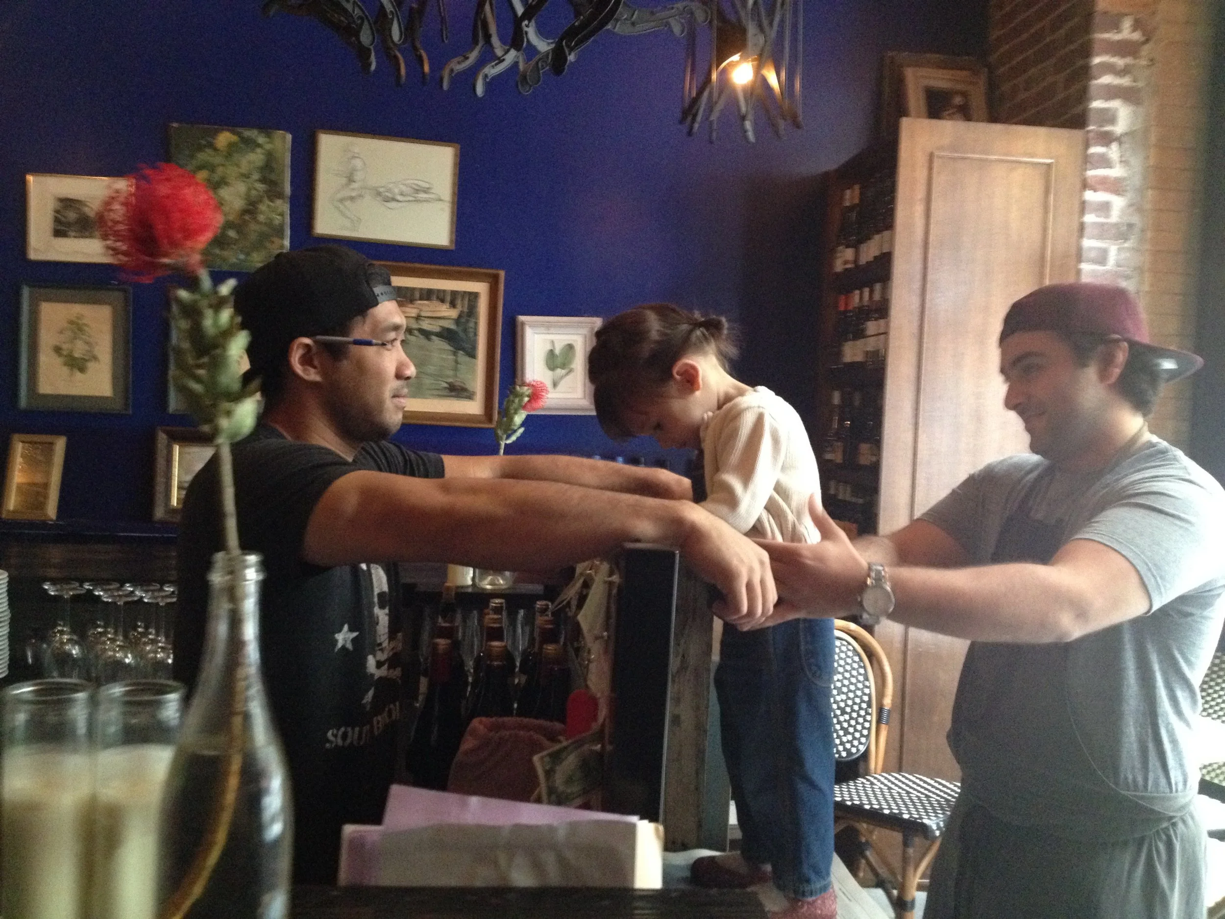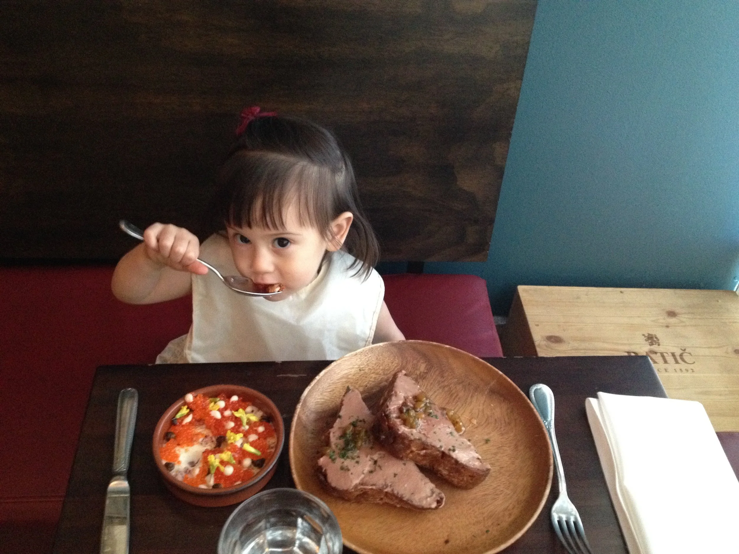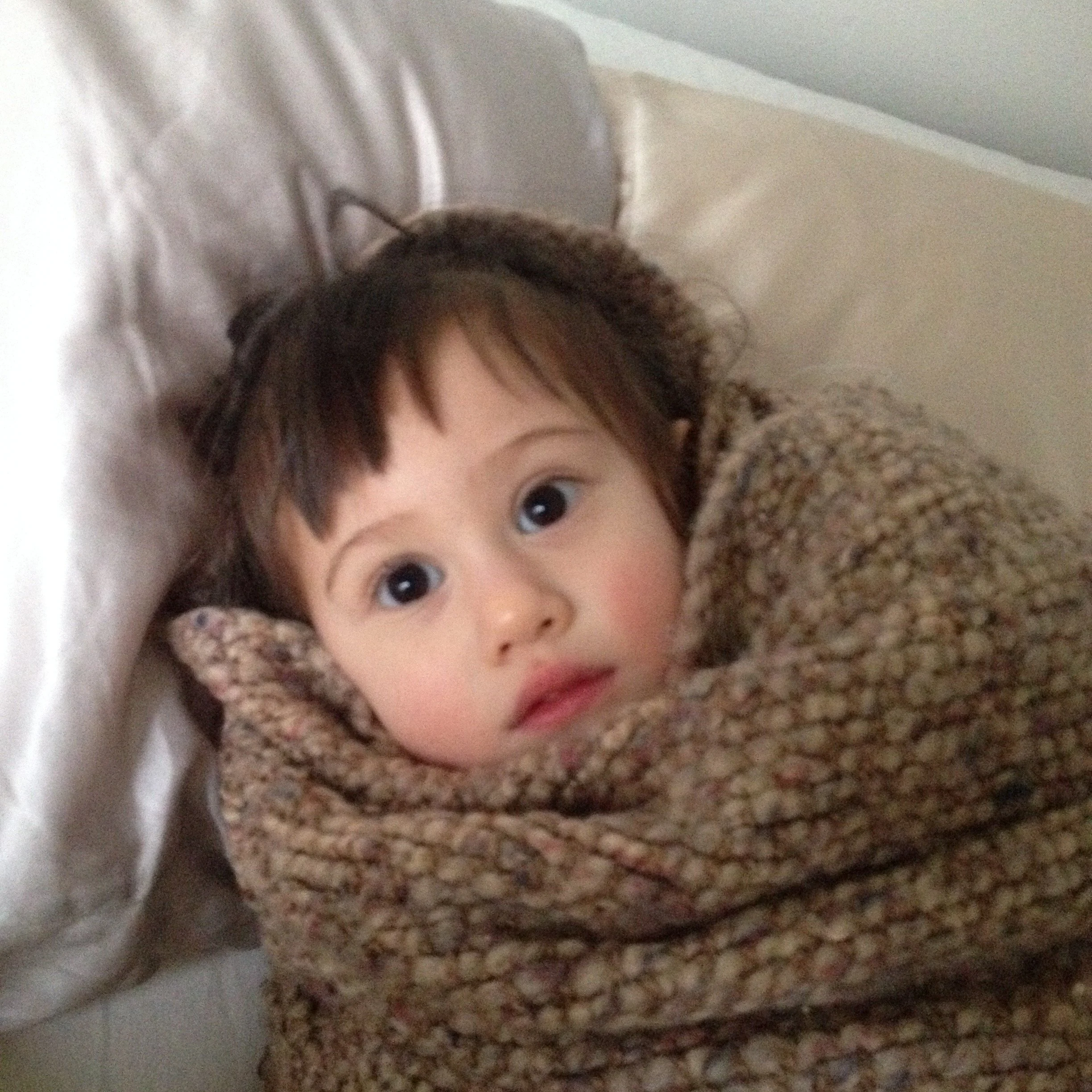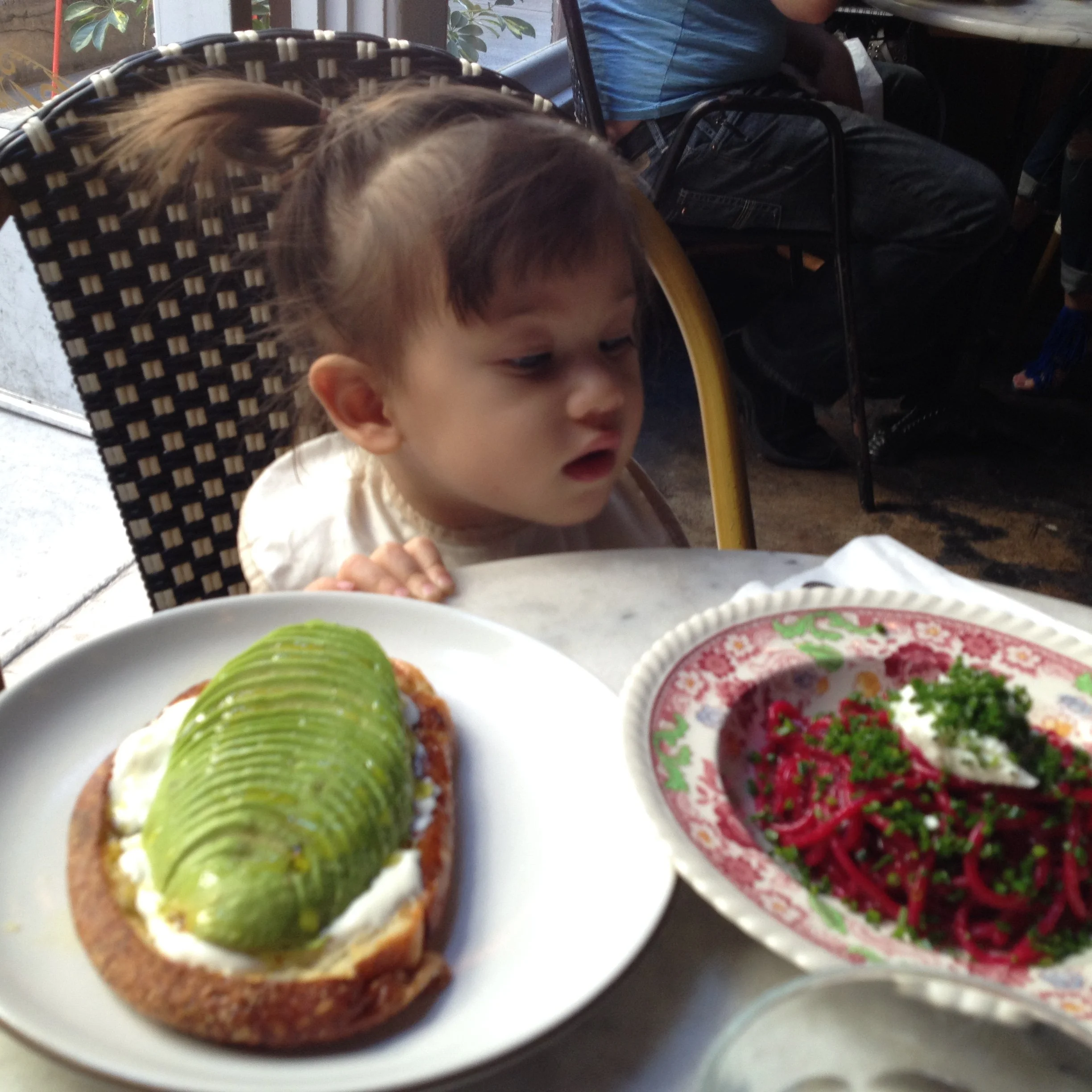 She speaks English. She dances and sings. She knows right from left and can get most of the way through the alphabet. She counts to ten and says please, thank you, and excuse me. She speaks in complete sentences 25% of the time. She knows most food names, including spices because she spends most of her time in the kitchen. She loves music and books, and insists I spend all day singing. She likes to get dressed up and go out.